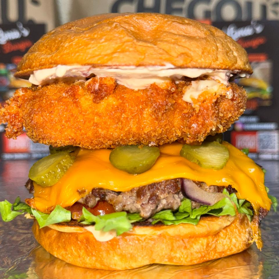 'Chicken Cheddar Burger' composto por pão brioche, que abriga um saboroso filé de frango empanado, generosamente coberto por um cheddar derretido, picles, cebola caramelizada, fatias de bacon crocante, tomate, alface e nossa baconese exclusiva farão você se apaixonar por esse burger.