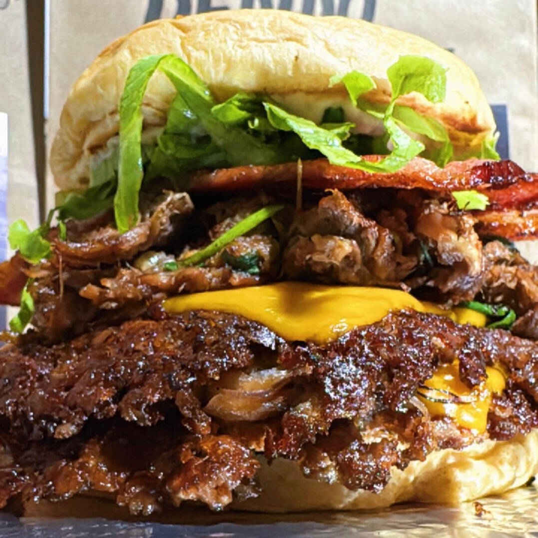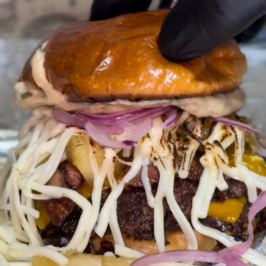Smash Burger Duplo composto por duas robustas carnes de 80g cada, servido em um pão brioche. Acompanha bacon defumado, cheddar suavemente derretido, cebola roxa, picles, cebola caramelizada, tomate fresco e alface. Para finalizar, nosso incomparável molho da casa irresistível. Uma combinação perfeita de sabores que promete uma experiência culinária inesquecível.