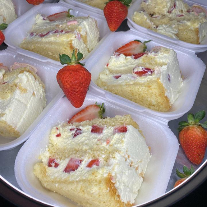bolo pão de ló massa branca bem molhadinha- brigadeiro branco famoso e camada de pudim - decorado chantilly e morango doce de leite