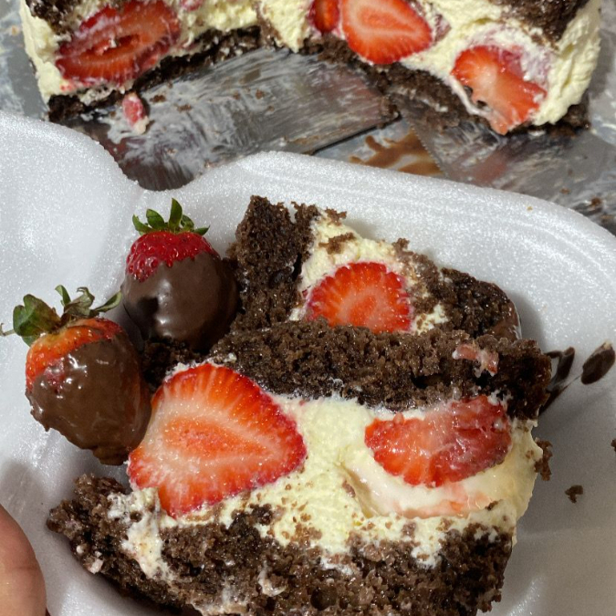 bolo de chocolate - recheio creme Leite ninho cremoso com morangos frescos inteiros no recheio - brigadeiro por cima e morango banhado no chocolate na decoração