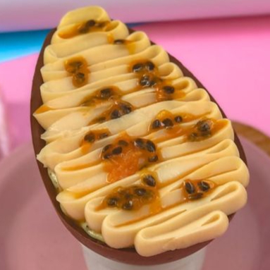 casca de chocolate e recheado leite ninho cremoso suave com mouse de maracujá por cima