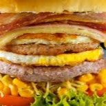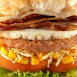 Pão, hamburguer, mussarela, bacon, ovo, alface, tomate e milho