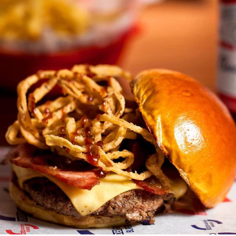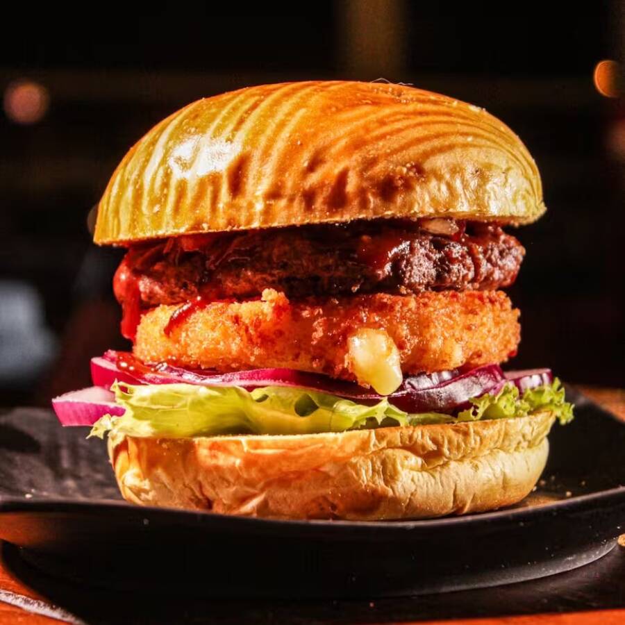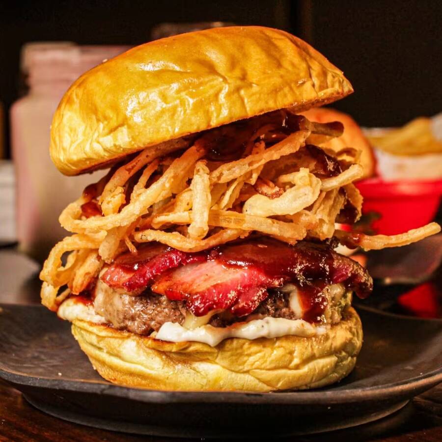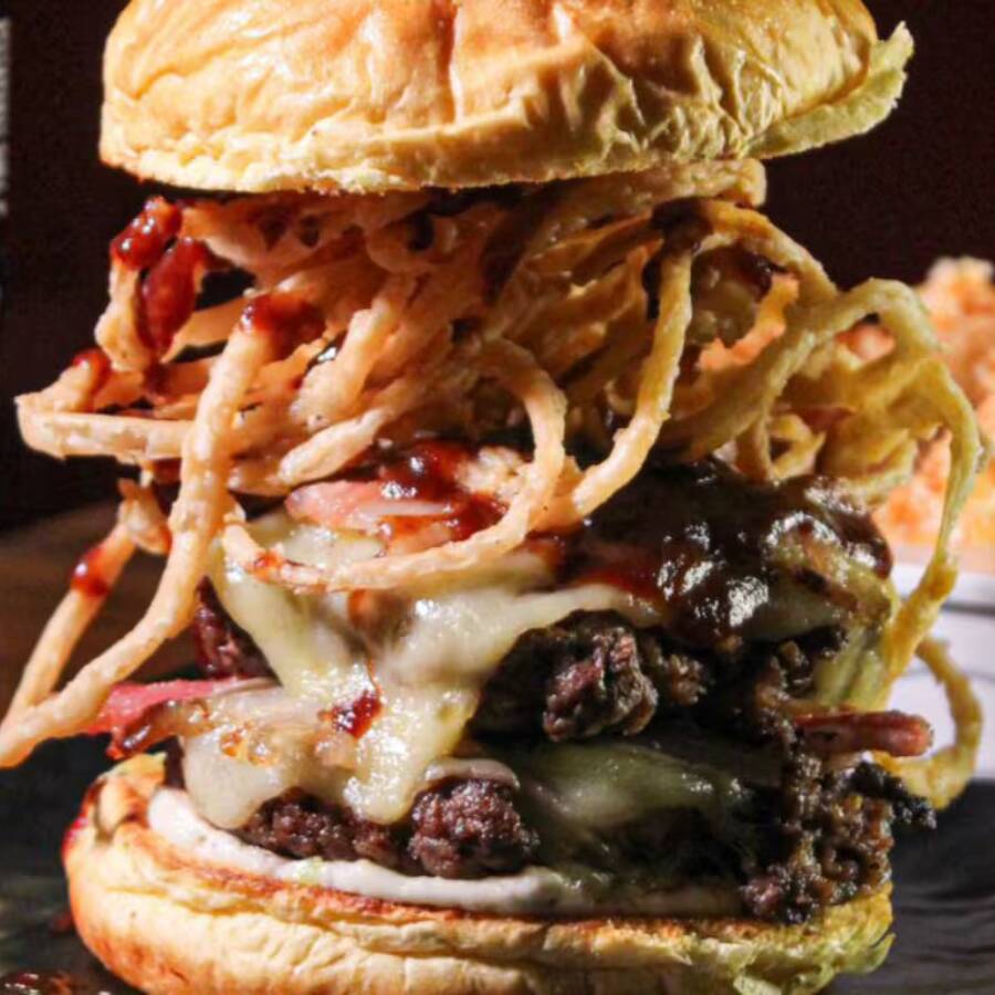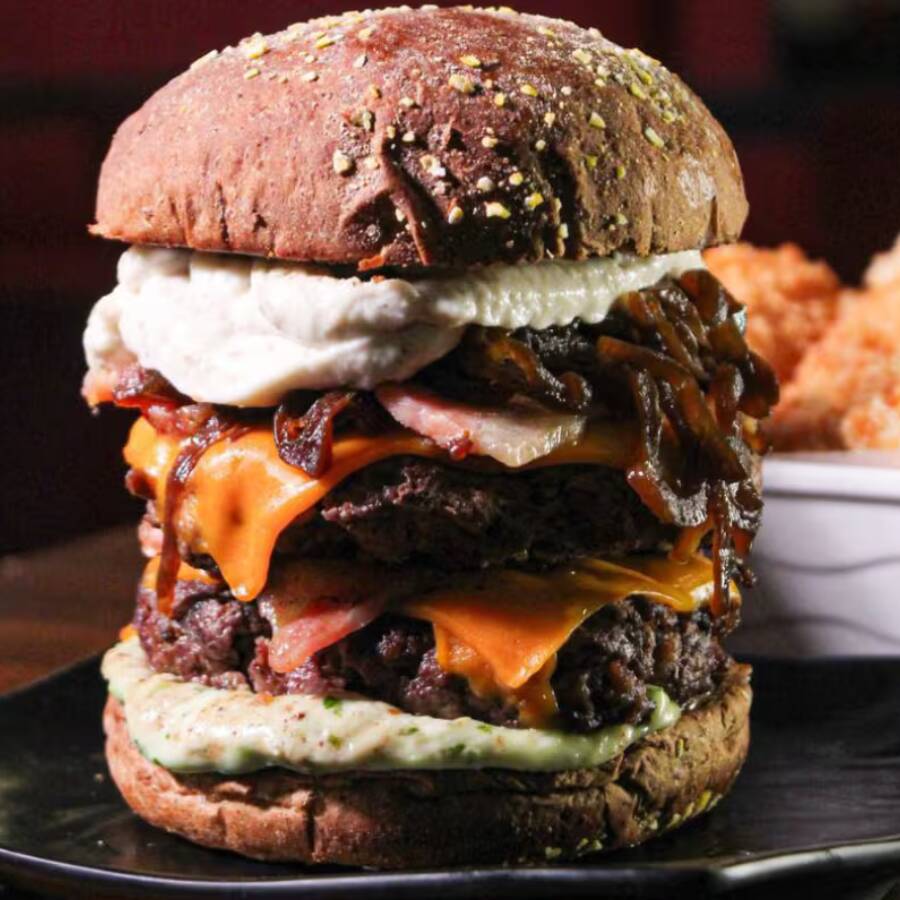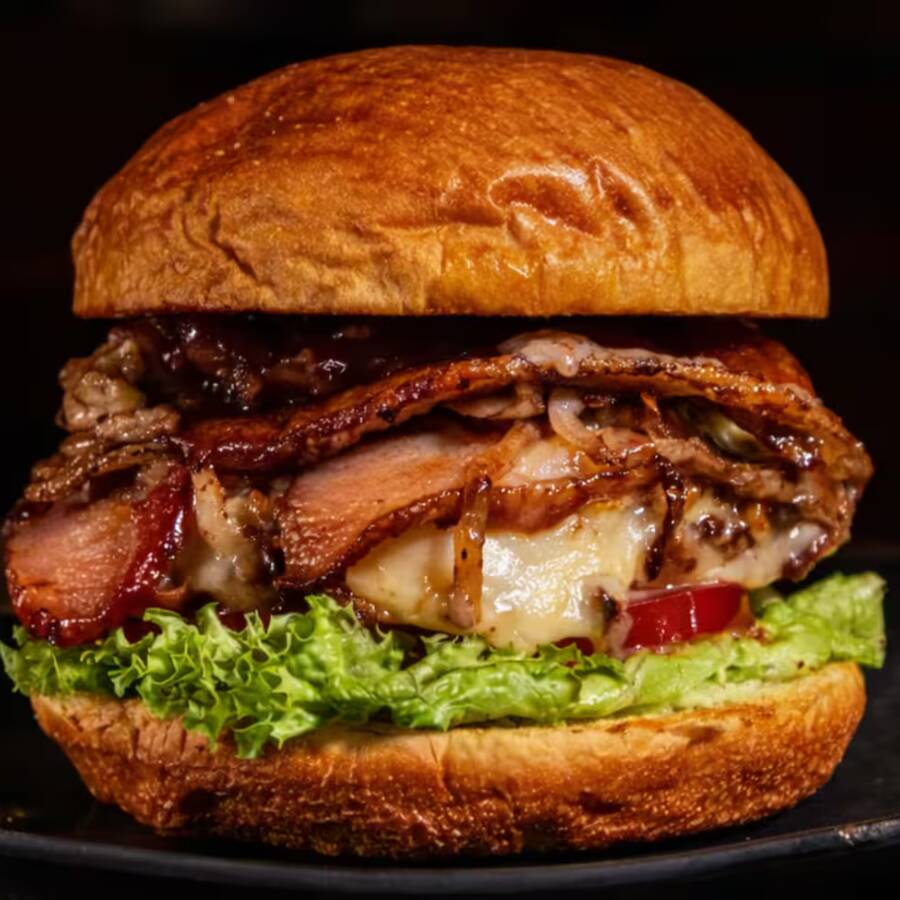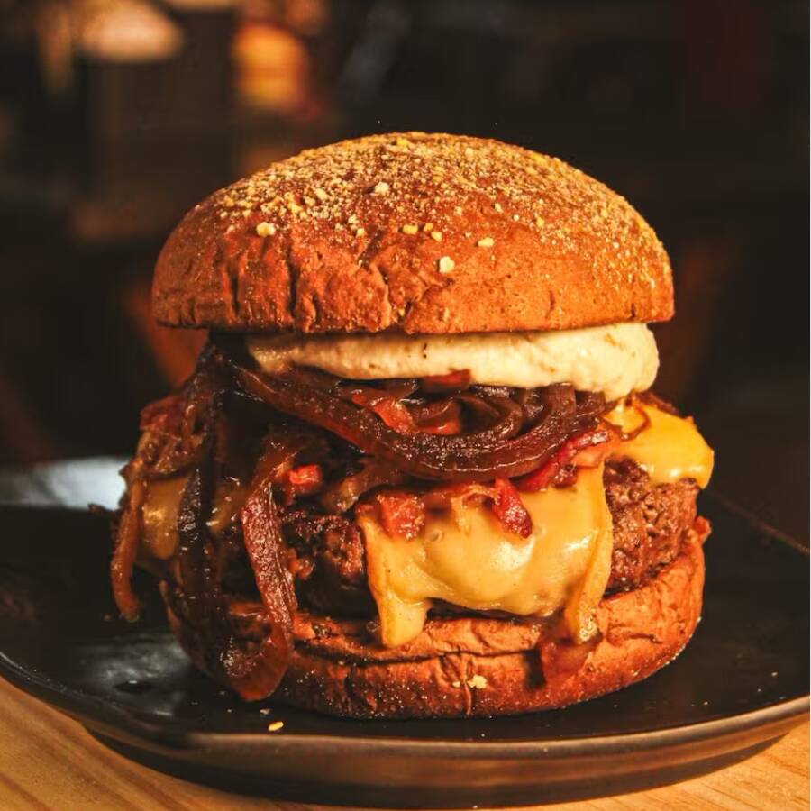 Carne Bovina em Dobro 180g No Pão Australiano, Cheddar Derretido, Bacon Crocante, Cebola Caramelizada, Molho de Ervas e Molho da Casa. Elegante, Forte e Absurdamente Saboroso!