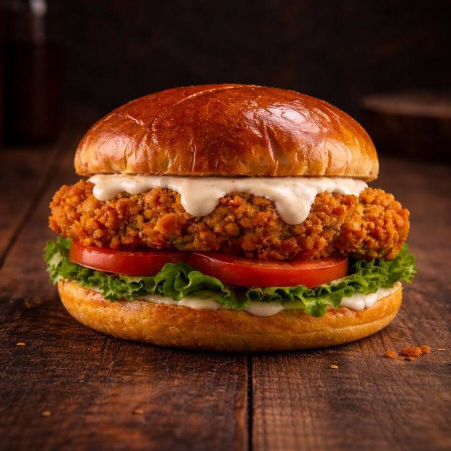 Frango Empanado Crocante, Cheddar Derretido e Molho de Bacon no Pão Brioche Macio com Alface e Tomate Frescos. Explosão de Sabor Que Dá Água Na Boca Só de Olhar!
