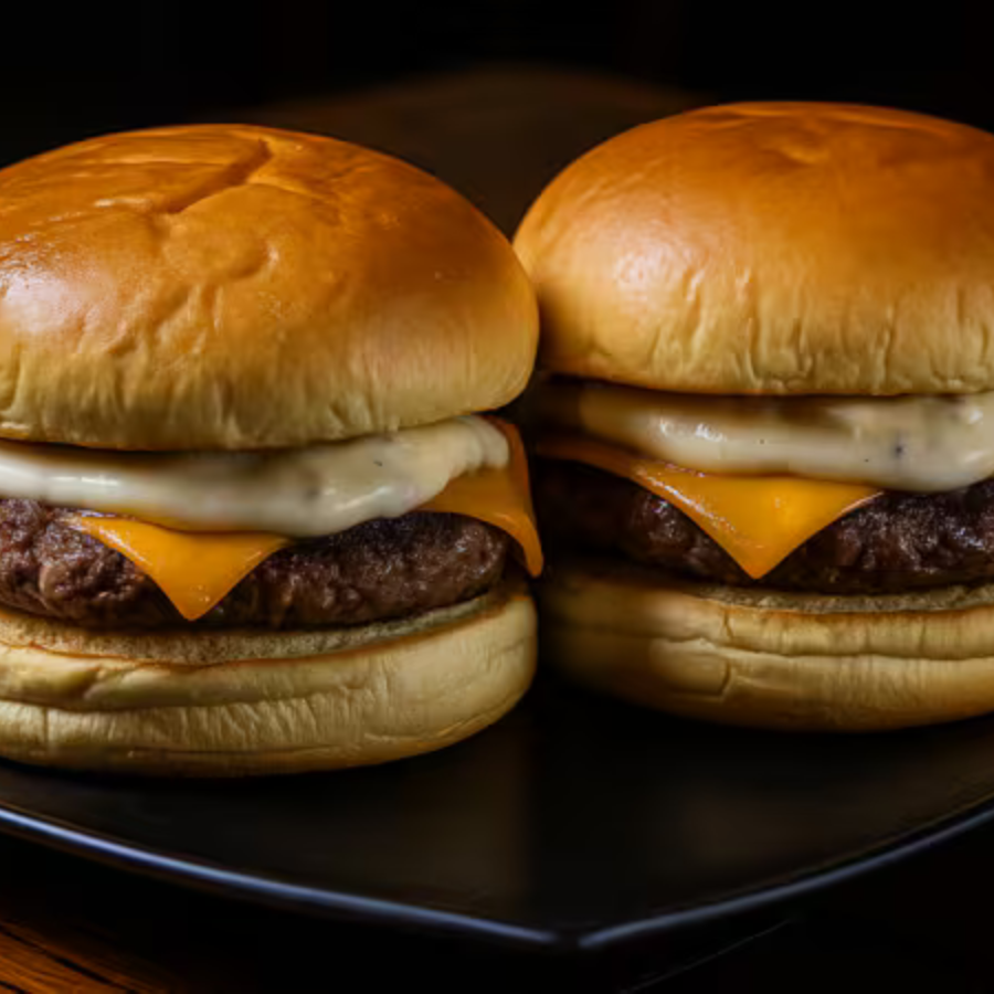 2 Hambúrgueres 100g com Queijo Derretido e Molho da Casa no Pão Brioche. Duplo, Suculento e Feito Pra Quem Não Divide Sabor!