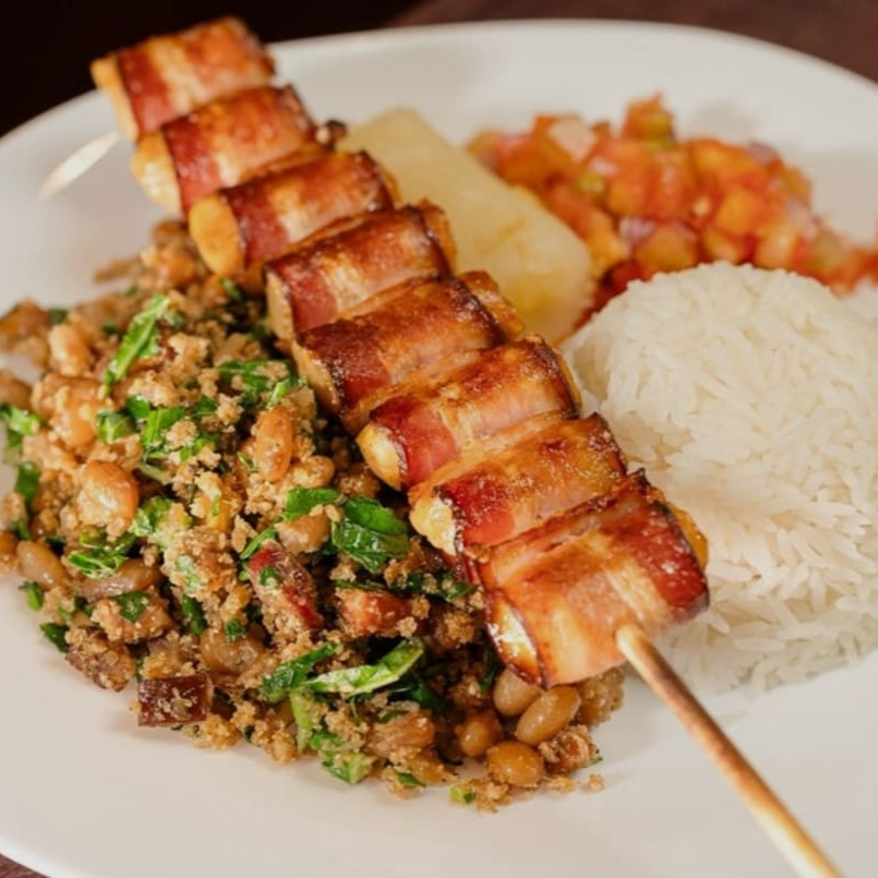 arroz ,feijão tropeiro, mandioca, vinagrete, espeto picanha montada