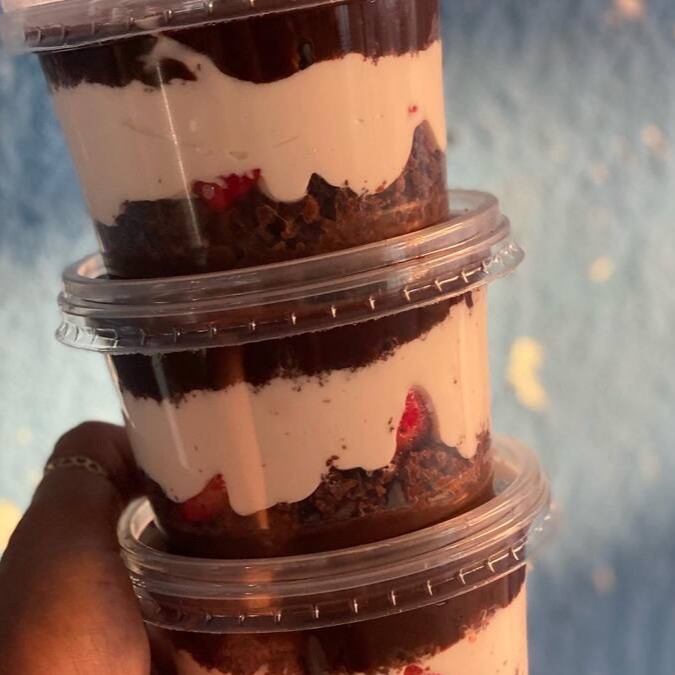 Massa de chocolate, Recheio Brigadeiro ,Morango e Mousse de Ninho Morango (Pedaços)250 ml