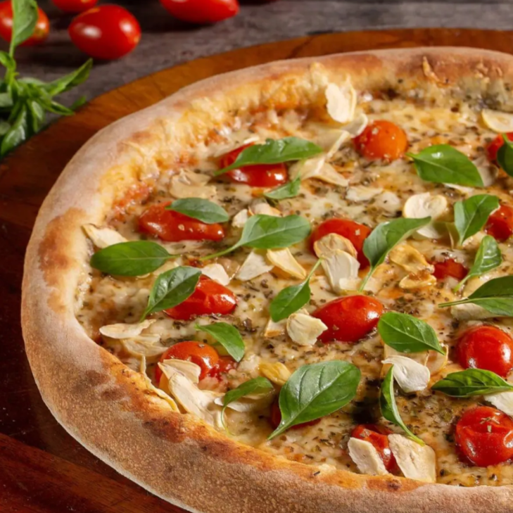 Massa Artesanal, Molho de Tomate Caseiro, Muçarela, Frango Desfiado, Catupiry, Orégano.