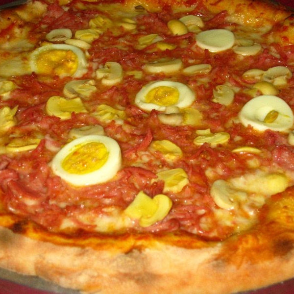 Massa Artesanal, Molho de Tomate, Muçarela, Presunto, Ovo, Azeitona, Orégano.