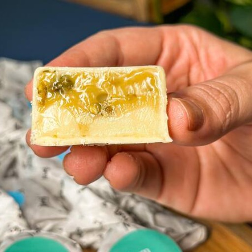 Zero açúcar e com whey protein. Bombom de chocolate belga recheado com brigadeiro branco e ganache de maracuja.