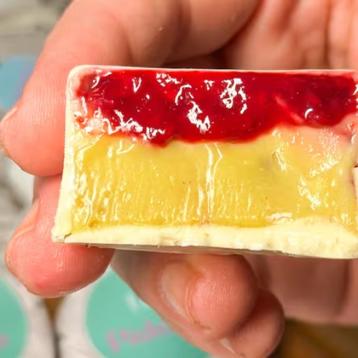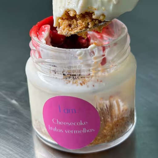 Zero açúcar, baixo carboidrato e com whey protein. Creme de Ninho, redução de frutas vermelhas em uma camada de farinha de amêndoas.