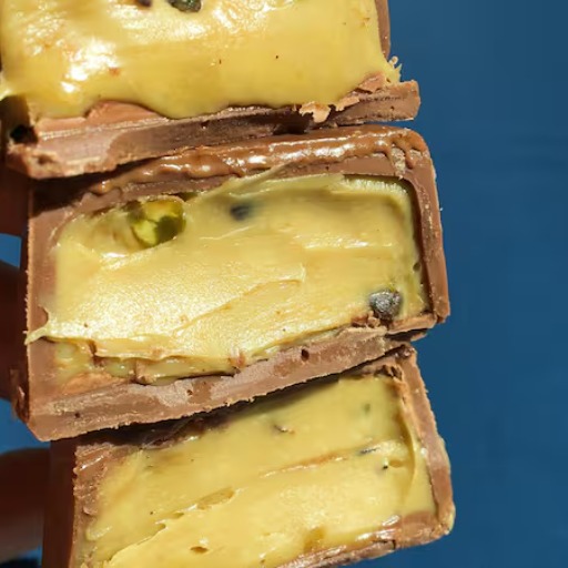 Zero açúcar e com whey protein. Bombom de chocolate belga recheado com brigadeiro de pistache.