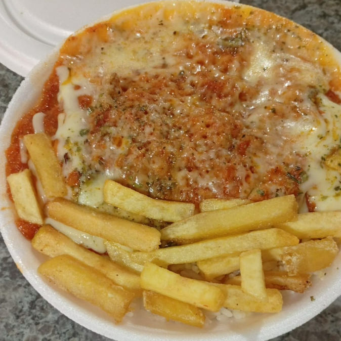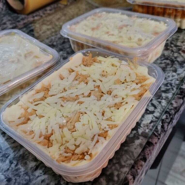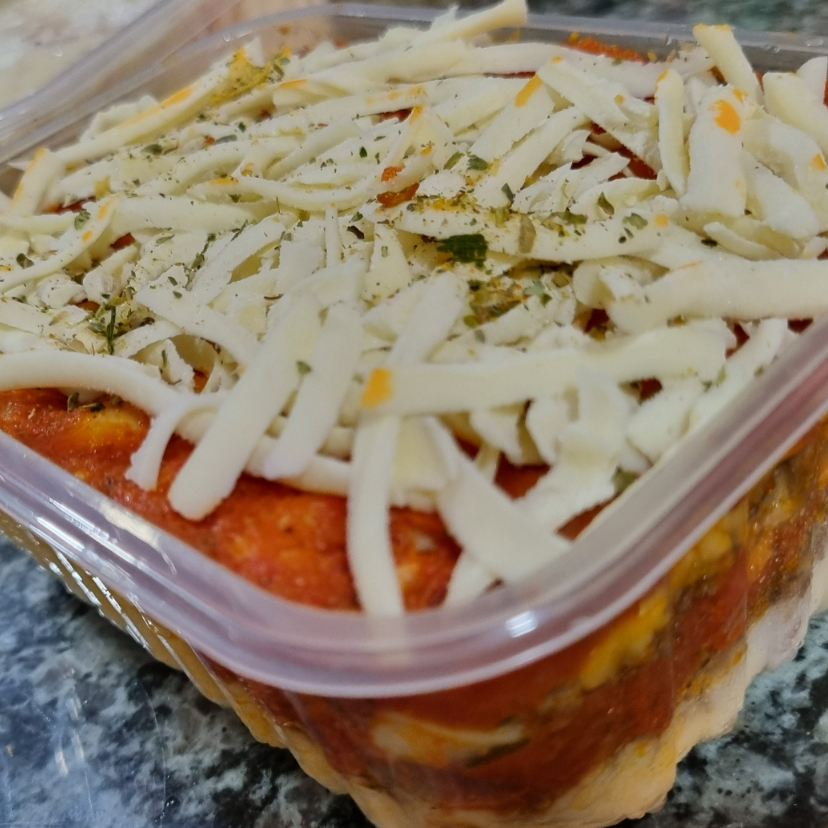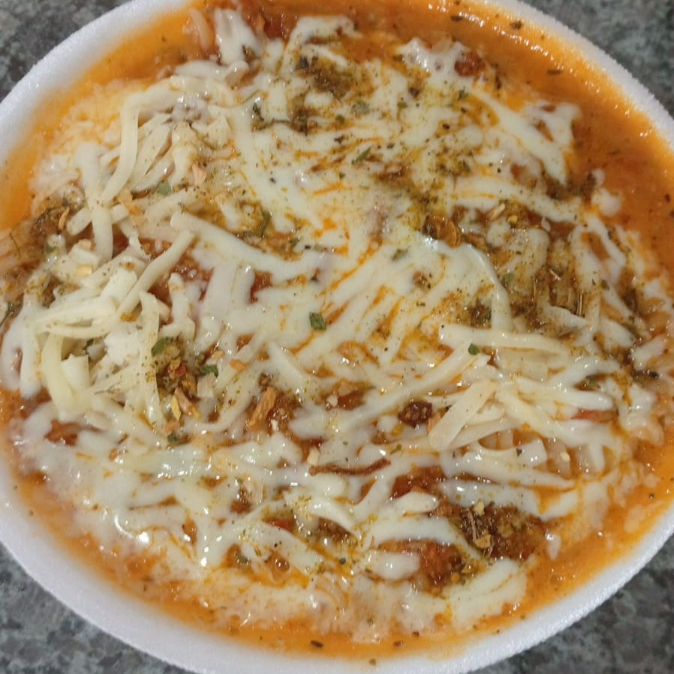 Massa, molho branco, molho vermelho, carne moida, mussarela.
