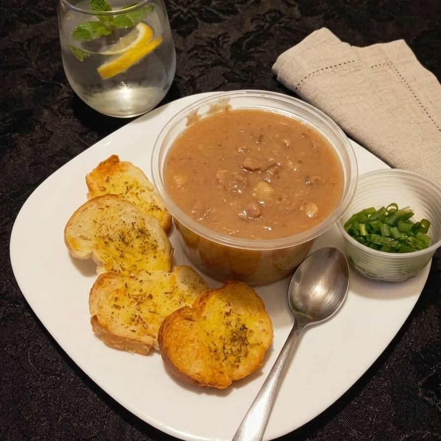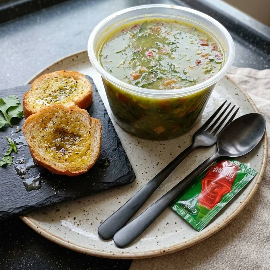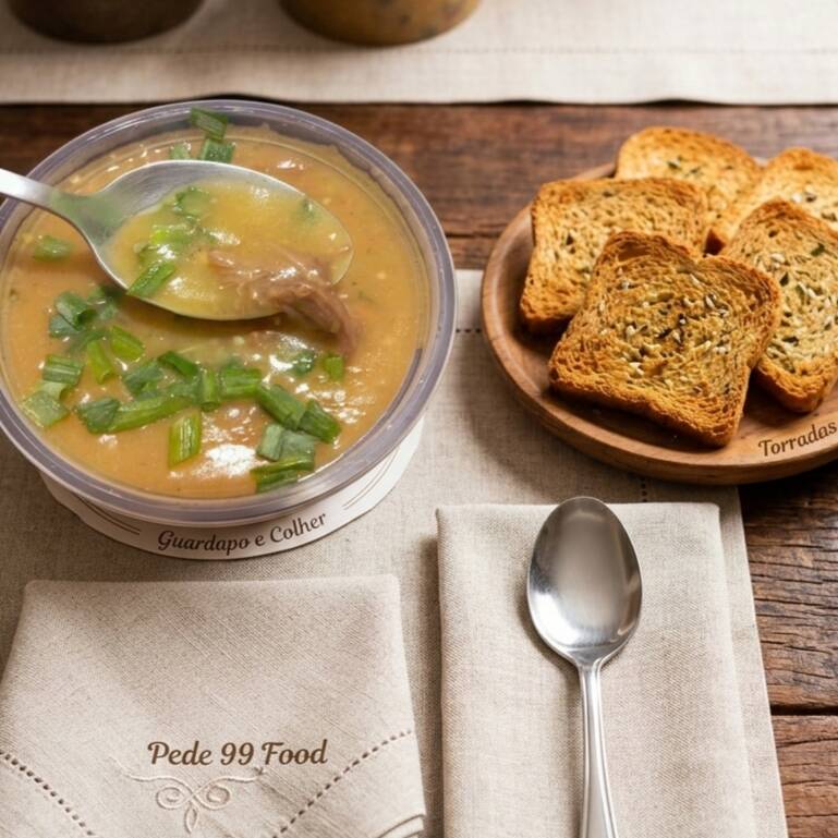 Frango desfiado, caldo engrossado no milho, acompanha torradas 500ml.