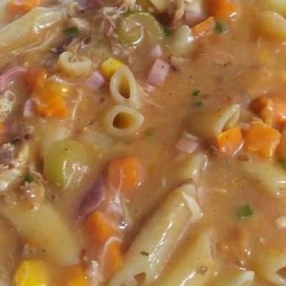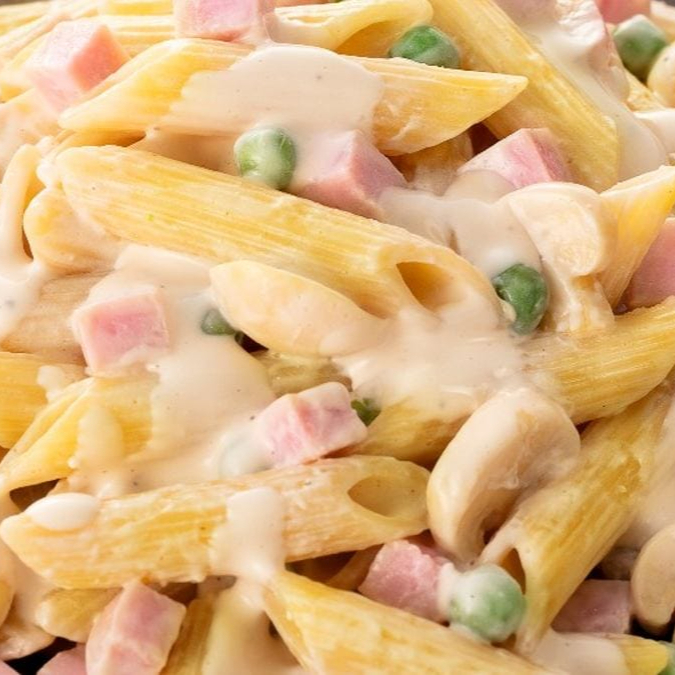 Penne ,frango,bacon,presunto,milho,ervilha e queijo no molho branco.