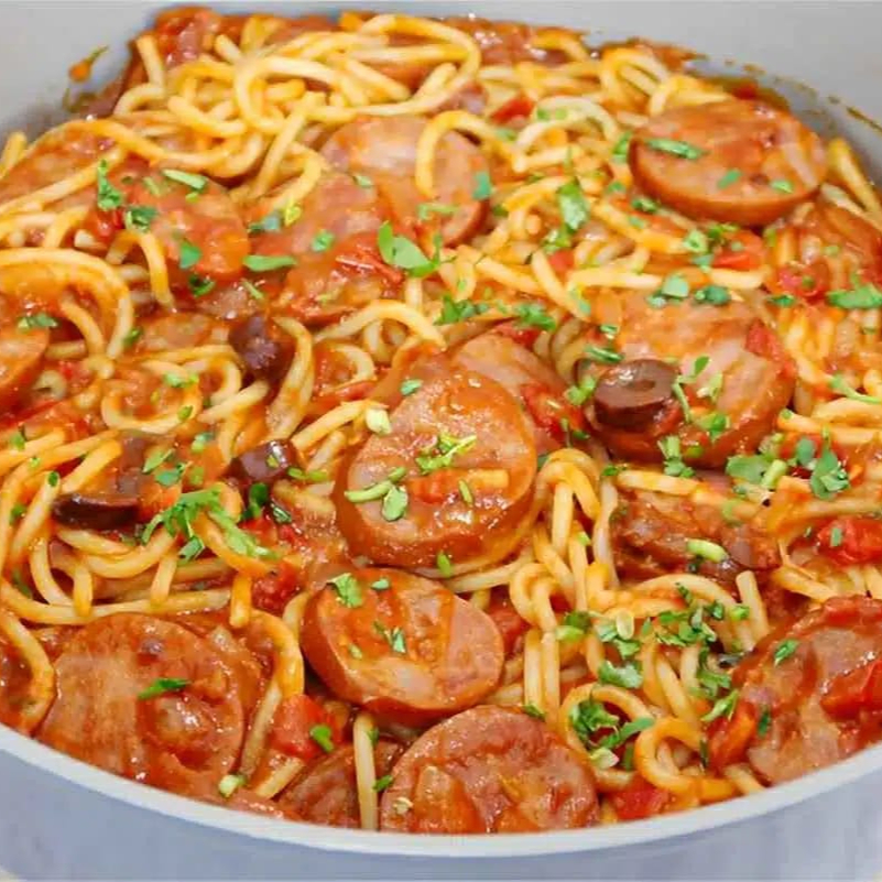 200grs de massa com salsicha e calabresa no molho vermelho