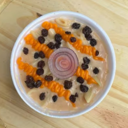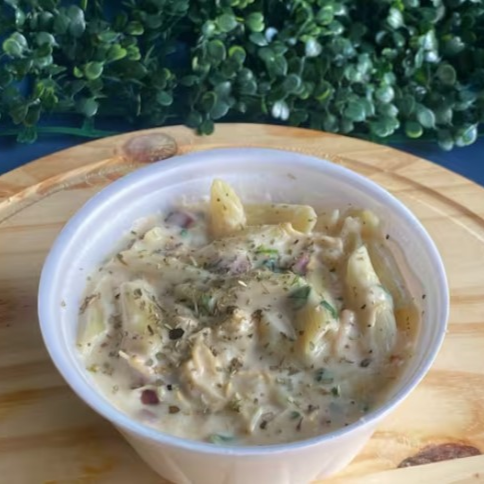 Macarrão penne, banhado no molho branco especial, acompanha, frango desfiado, calabresa, orégano, mussarela e batata palha.