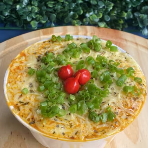 Macarrão espaguete, banhado no nosso saboroso molho à bolonhesa, carne moída , milho, cheiro verde, mussarela.
