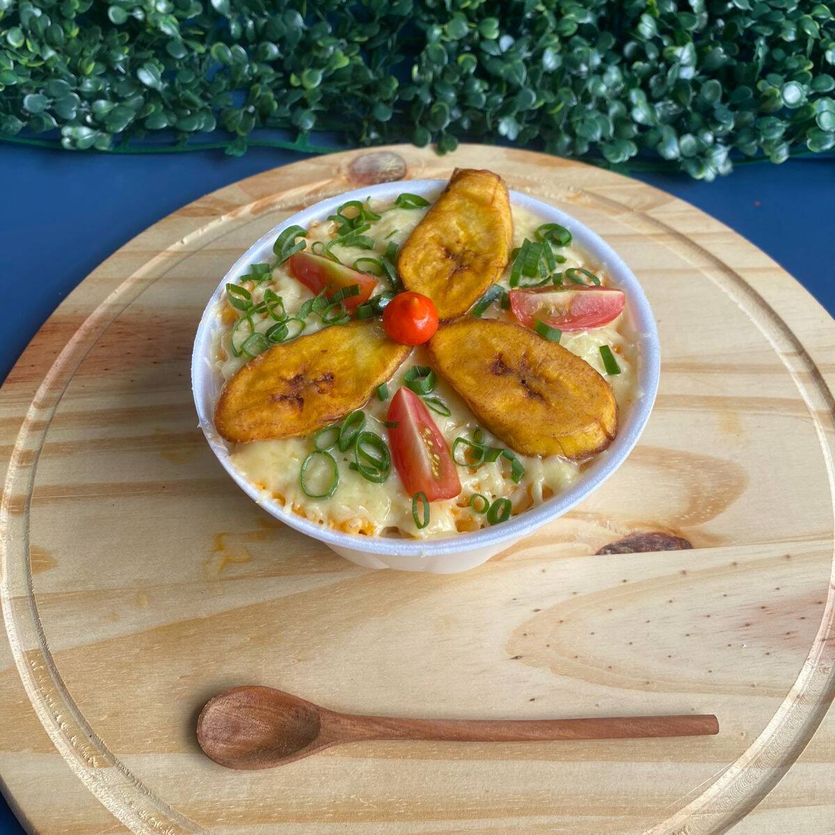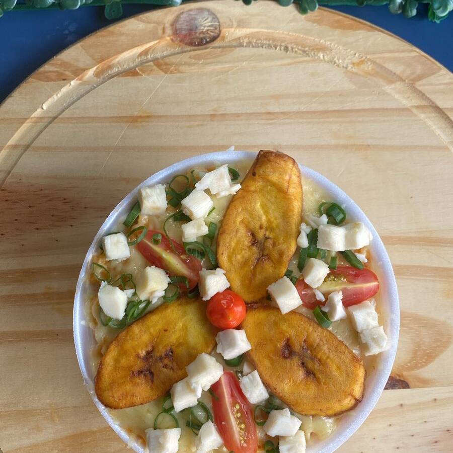 Acompanha um arroz, tenros cubos de filé de frango, apetitosa linguicinha de frango e um toque especial de requintado requeijão cremoso com Catupiry. Além disso, você vai se surpreender doçura da banana frita com a salgada mussarela derretida. Para finalizar, cebolinha picada fresca e tomate maduro adicionam uma explosão de sabor e cor ao prato.