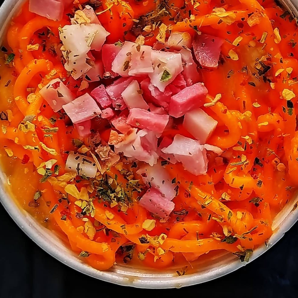 Macarrão perfeitamente cozido, molho rosé do cheff incrivelmente cremoso, bacon , calabresa se unem, tudo finalizado com temperos especiais. E aqui está o toque mágico: uma generosa camada de requeijão cremoso e mussarela derretida, em perfeita harmonia . Tudo isso é servido em um pote para manter os sabores incríveis juntos. Aprox. 750g