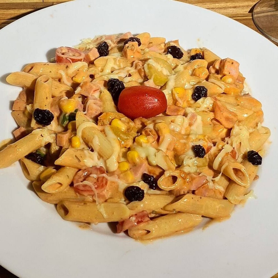 Macarrão Misto preparado com presunto dourado na manteiga, com molho rosê e um delicioso molho especial da casa feito de queijos selecionados.a.