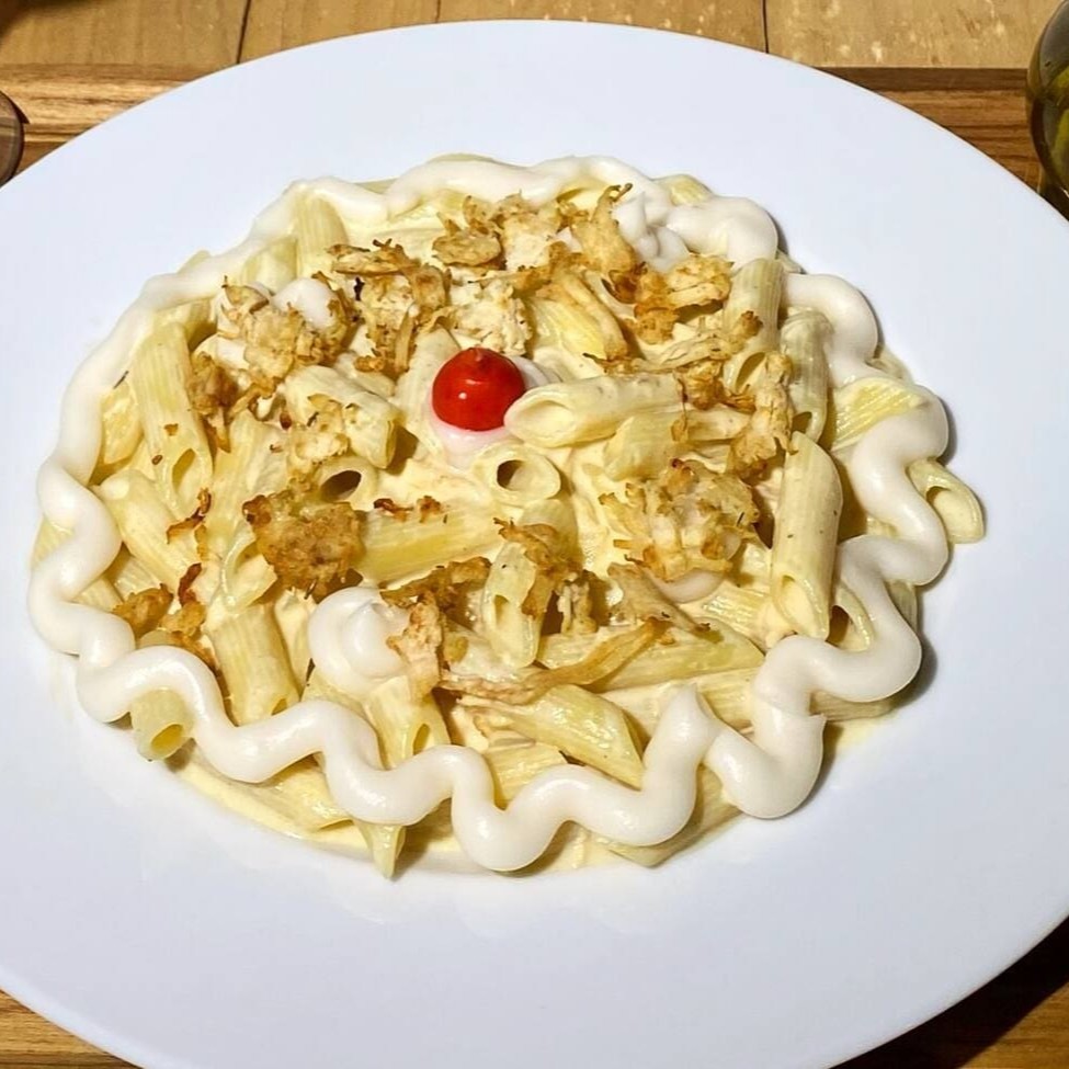 Delicioso macarrão penne com frango desfiado e refogado no alho cebola e os temperos especiais da casa, com molho branco e finalizado com Catupiry cremoso. Uma opção de dar agua na boca.