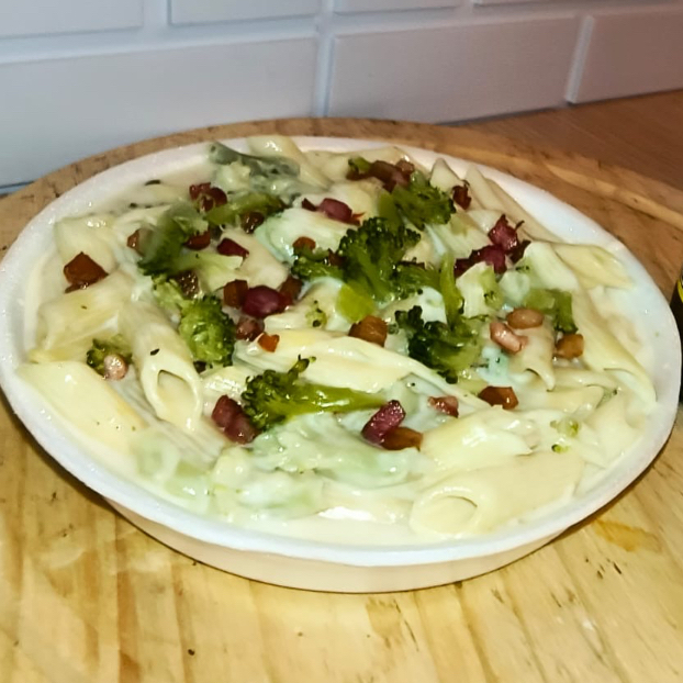 Macarrão Penne Cozido al dente, com um delicioso molho branco, Brócolis e bacon