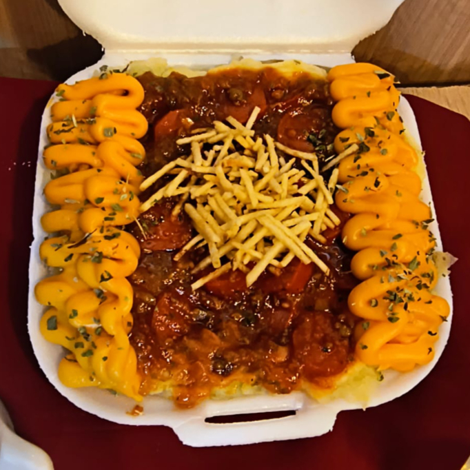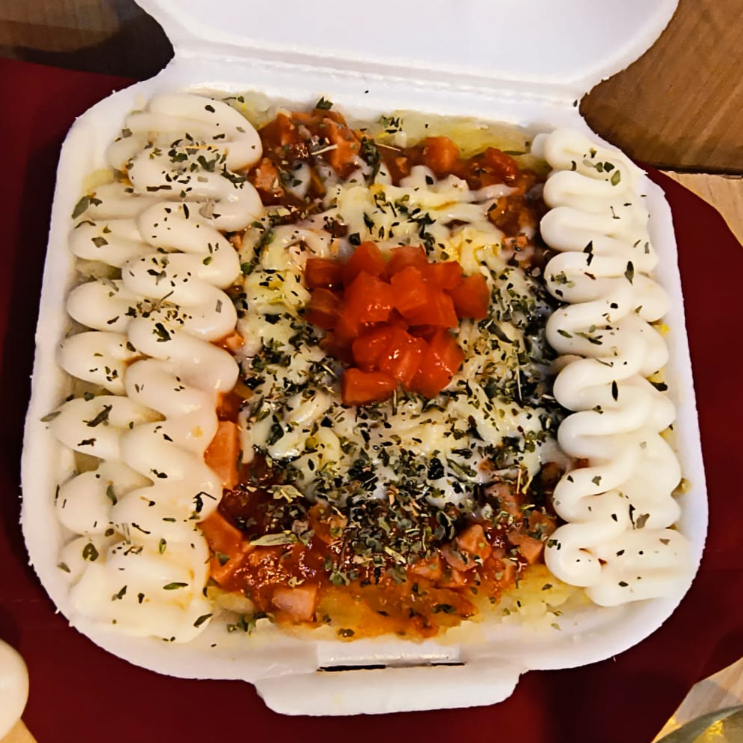 A clássica Batata À Bolonhesa! Batata na manteiga e sal, recheada com carne moída em molho especial. Finalizada com mussarela, orégano e o frescor da cebolinha. Adicione mais recheios e deixe ela perfeita para você!