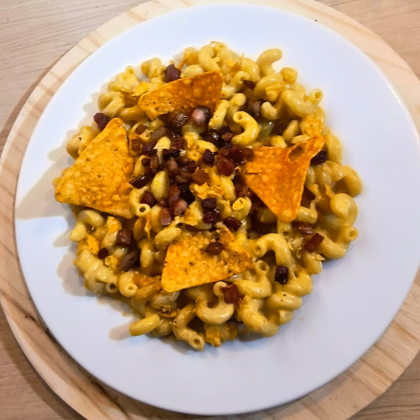 Mac and Cheese Especial: Macarrão caracol mergulhado em um rico molho cheddar, com pedaços de bacon e o toque crocante do Doritos.