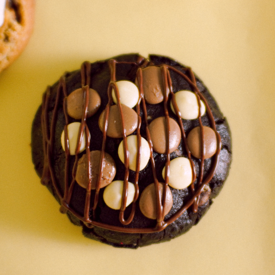 Massa de cacau black, com sabor intenso e duçor na medida certa, com muitas gotas de chocolate branco, 70% e ao leite, crocante por fora e úmido por dentro, recheada com uma deliciosa duja de avelãs no chooclate branco e finalizada com gotas dos três chocolates.