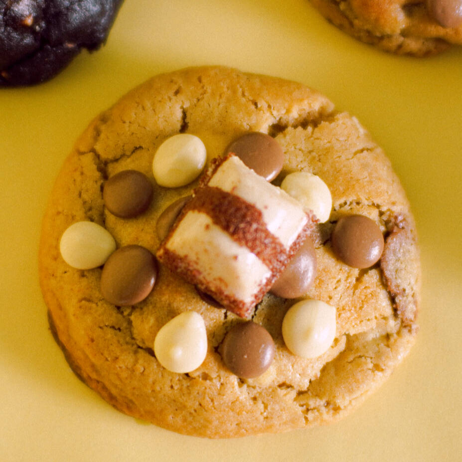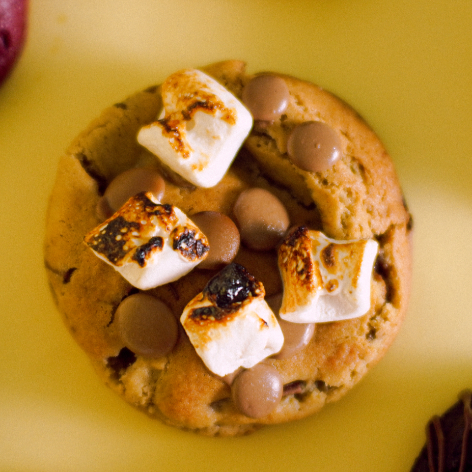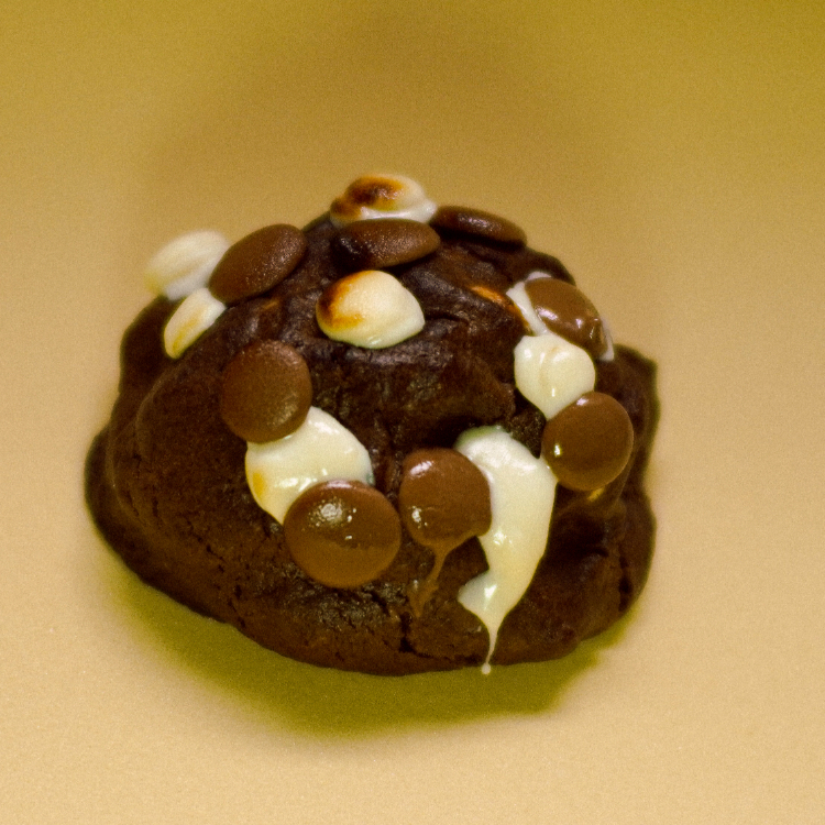 Massa de baunilha com muitas gotas de chocolate ao leite, crocante por fora e macia por dentro, recheada com um delicioso ganache de chocolate ao leite e marshmallow, finalizado com gotas de chocolate e pedaços de marshmallow maçaricados.