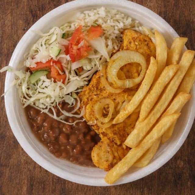 Bife de frango acebolado, bem temperado e grelhado no ponto certo, acompanhado de arroz branco soltinho, feijão caseiro, batata frita crocante e salada fresca.