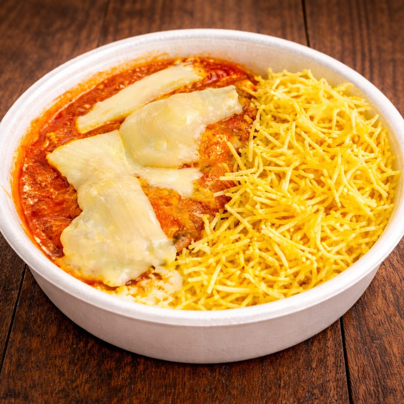 Peito de frango empanado e crocante, coberto com molho saboroso e queijo derretido. Acompanha arroz branco soltinho e batata palha formando uma refeição completa, bem servida e irresistível. Perfeita para o almoço ou jantar.