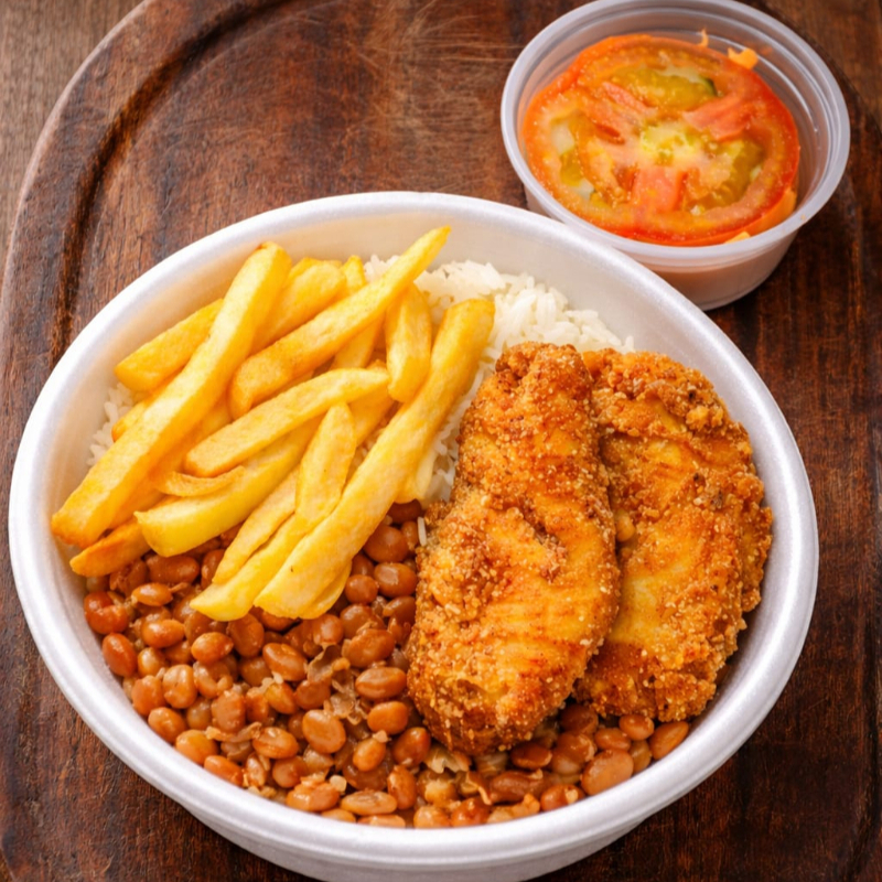 Uma combinação perfeita para quem ama comida caseira de verdade! Nosso prato acompanha arroz branco soltinho, feijão temperado, batata frita douradinha e crocante e filé de frango empanado, sequinho por fora e suculento por dentro. Para completar, acompanha salada fresca de tomate, trazendo leveza e equilíbrio à refeição.