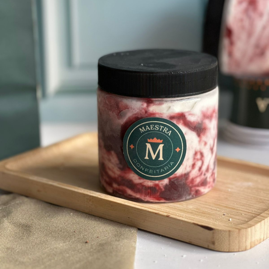 Creme artesanal à base de Leite em Ninho, geladinho, com adição de Redução de frutas vermelhas caseira, que traz um azedinho especial. Perfeito para você que procura um doce equilibrado, refrescante e que lembra um sorvete. Consumir congelado. Serve até 2 pessoas. Pote de 600ml, peso médio de 420g.