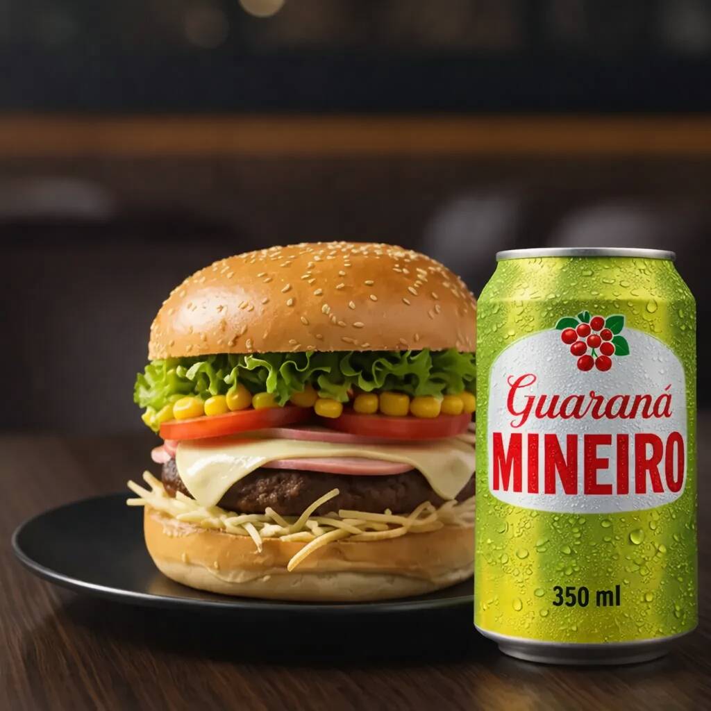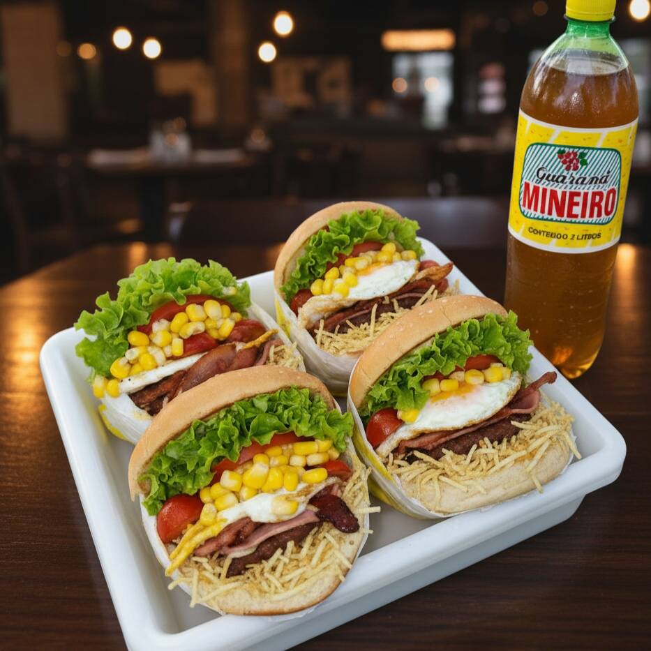 Pão, hambúrguer, bacon, ovo, salsicha, presunto, mussarela, alface, tomate, milho e batata palha. E ainda vai um mineiro de 350ml geladinha para completar a refeição!