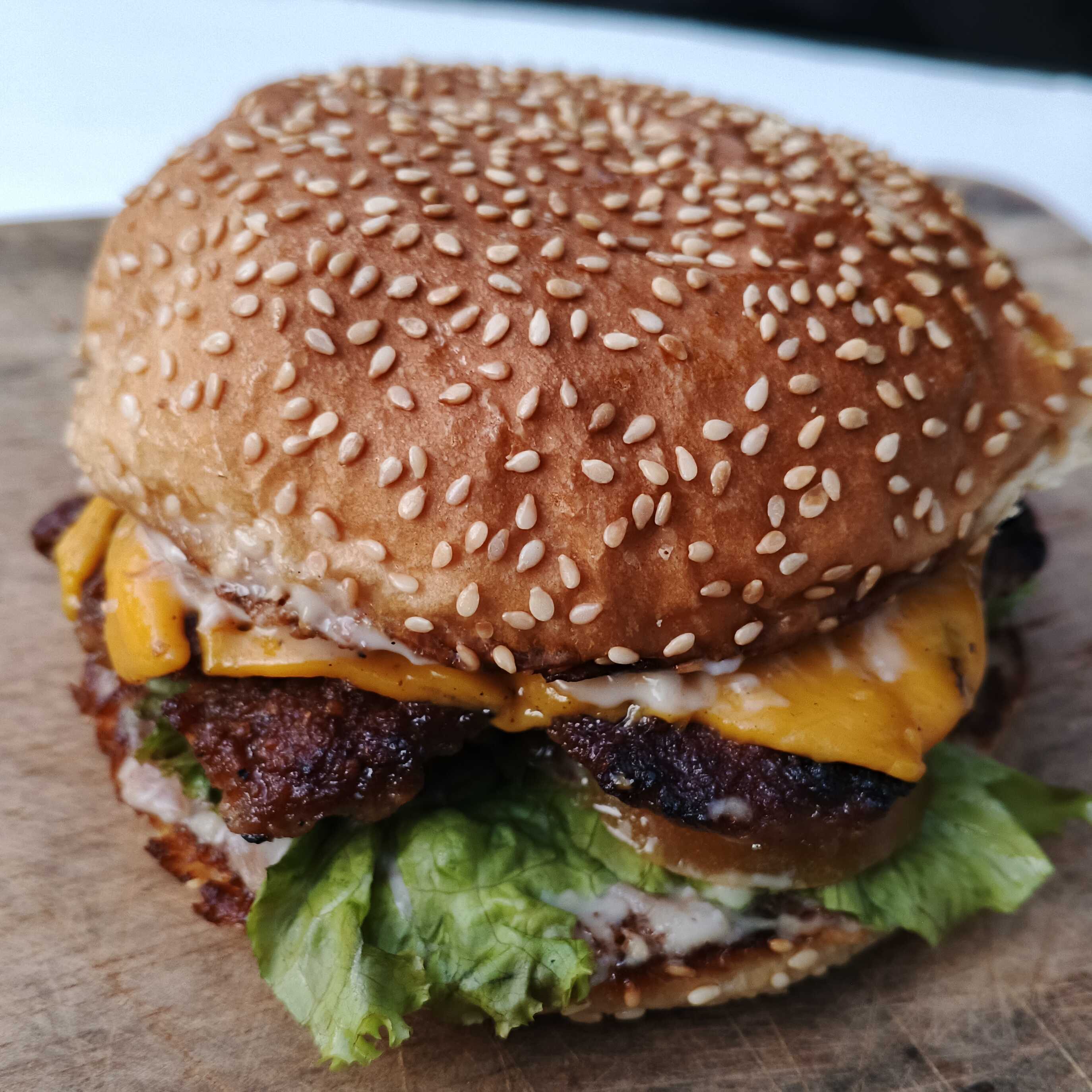 pão brioche, carne, mussarela, alface, tomate e molho da casa