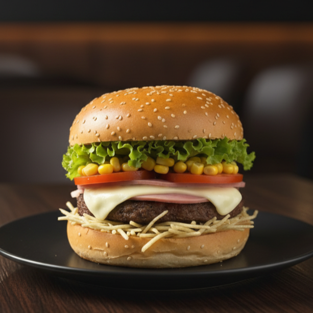 Pão, hambúrguer, bacon, ovo, salsicha, presunto, mussarela, alface, tomate, milho e batata palha.