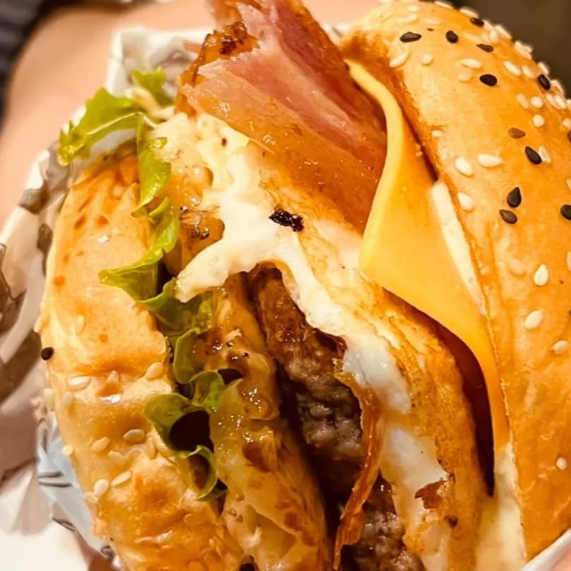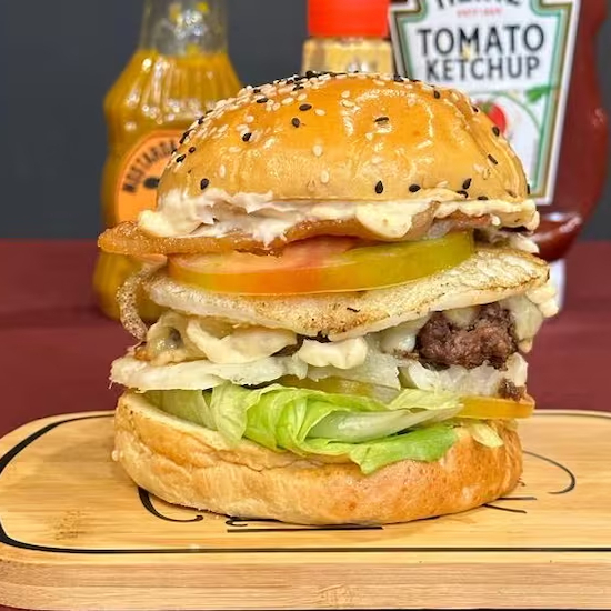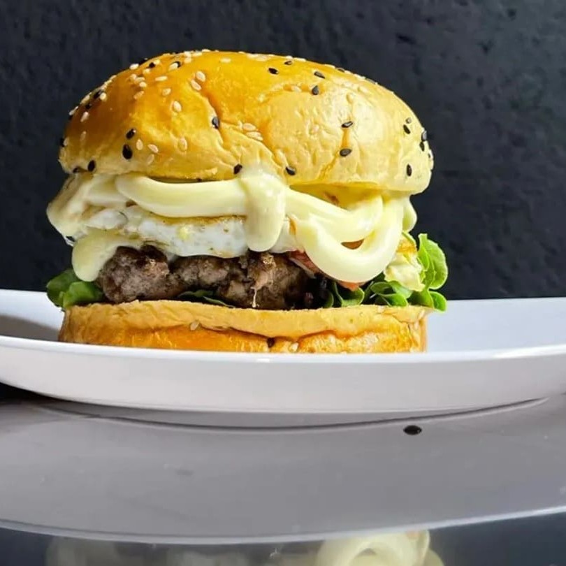 Pão, hambúrguer 100g, bacon, mussarela, rúcula, cebola roxa e creme de maionese da casa.