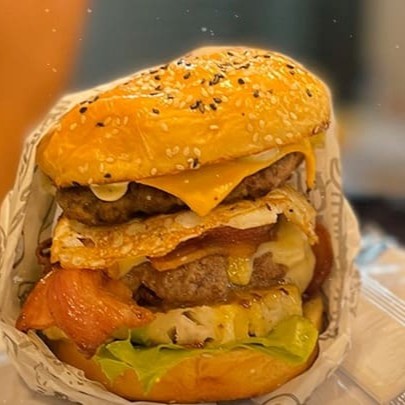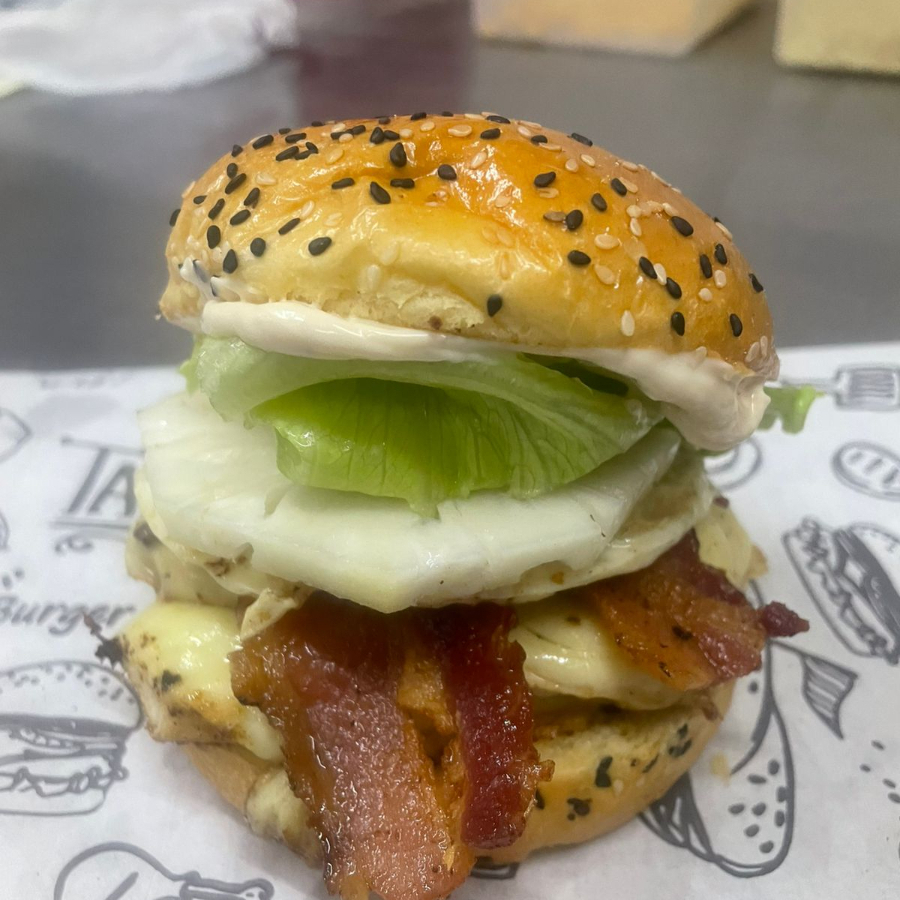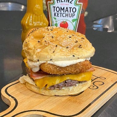 1 delicioso pão brioche super macio hambúrguer suculento queijo cheder Bacon crocante além de uma ótima mussarela empanada na farinha panko e pra finalizar uma fatia de abacaxi.