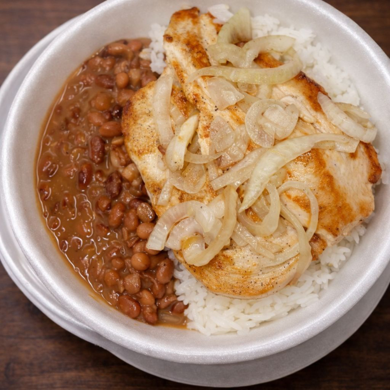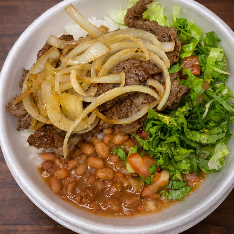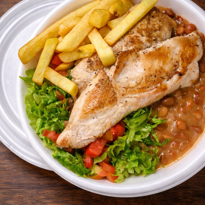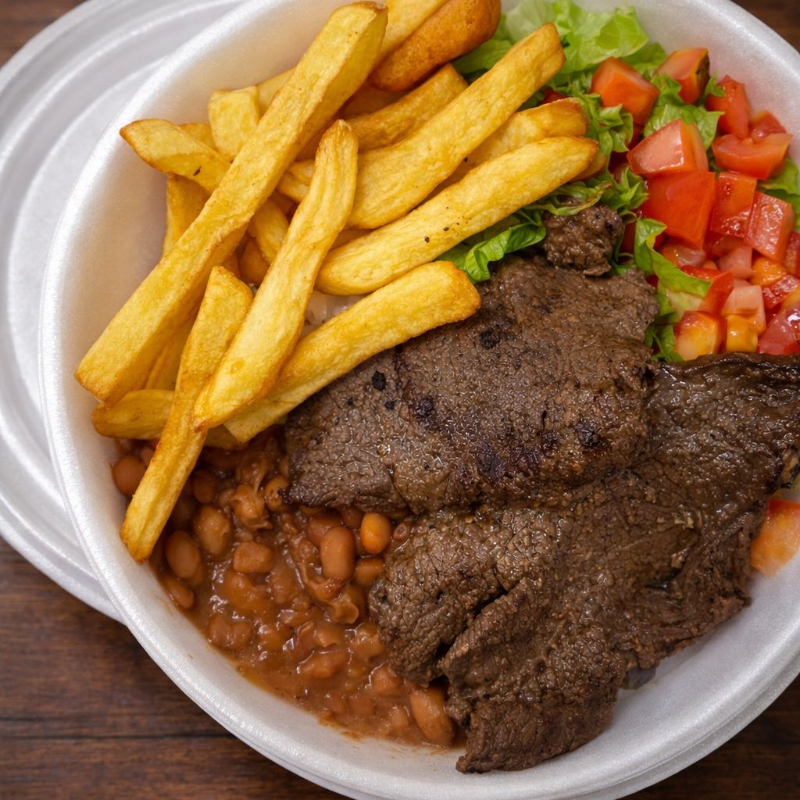 Contra filé super macio, arroz branco, feijão de caldo,batata frita e uma deliciosa salada com o tempero do chefe.