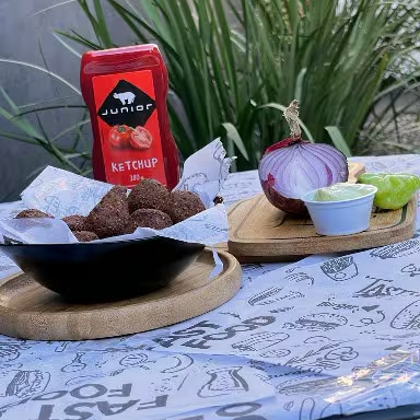 Pão, 2 hambúrguer 100g, ketchup e mostarda.