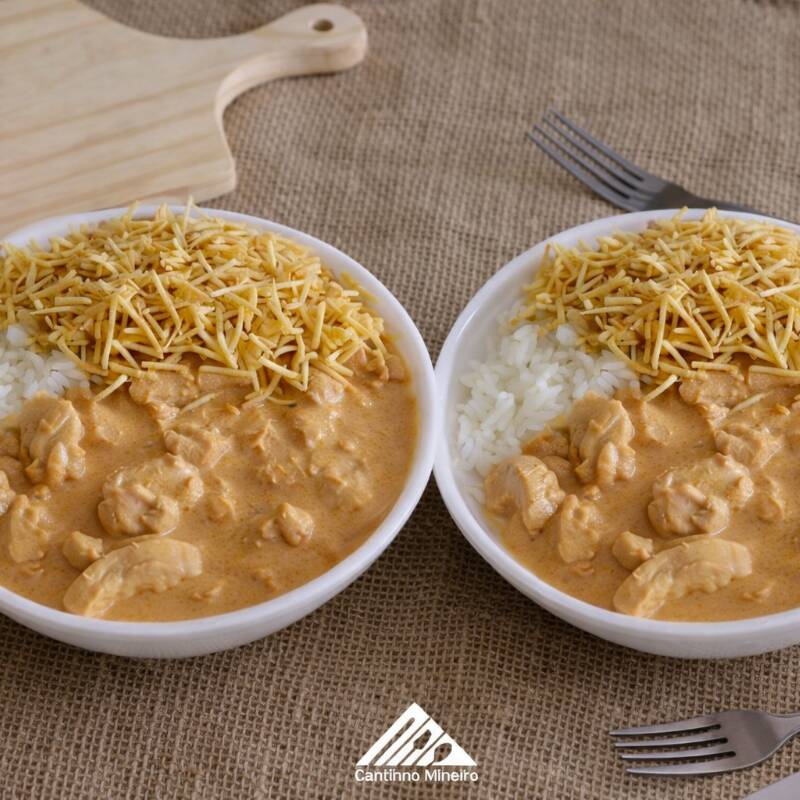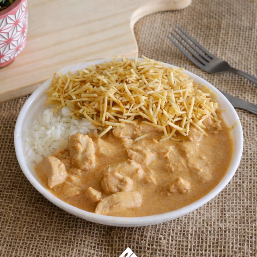 Marmita 500ml-Arroz soltinho, strogononoff de frango, batata palha.