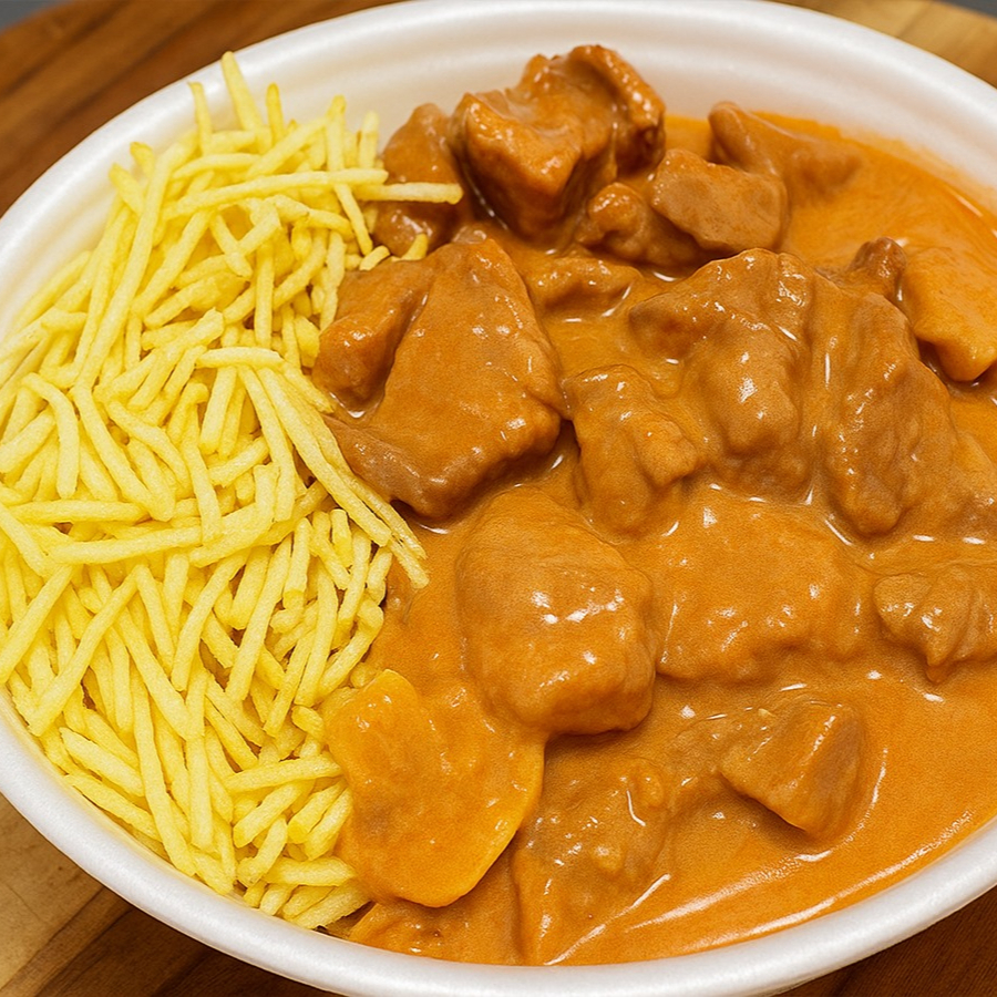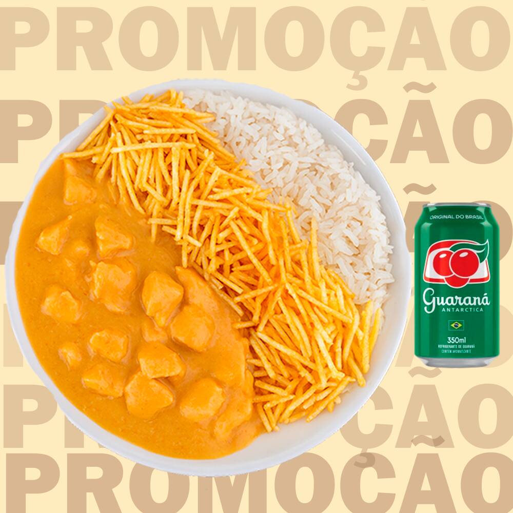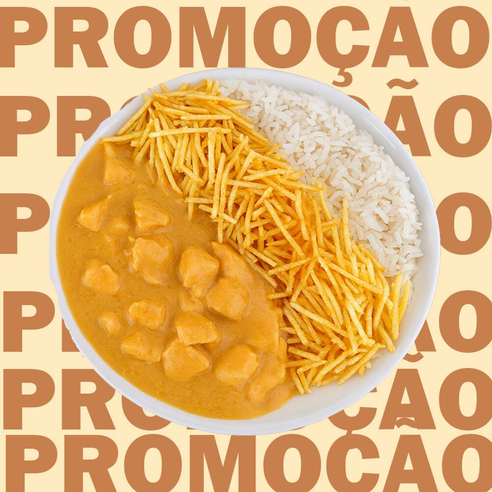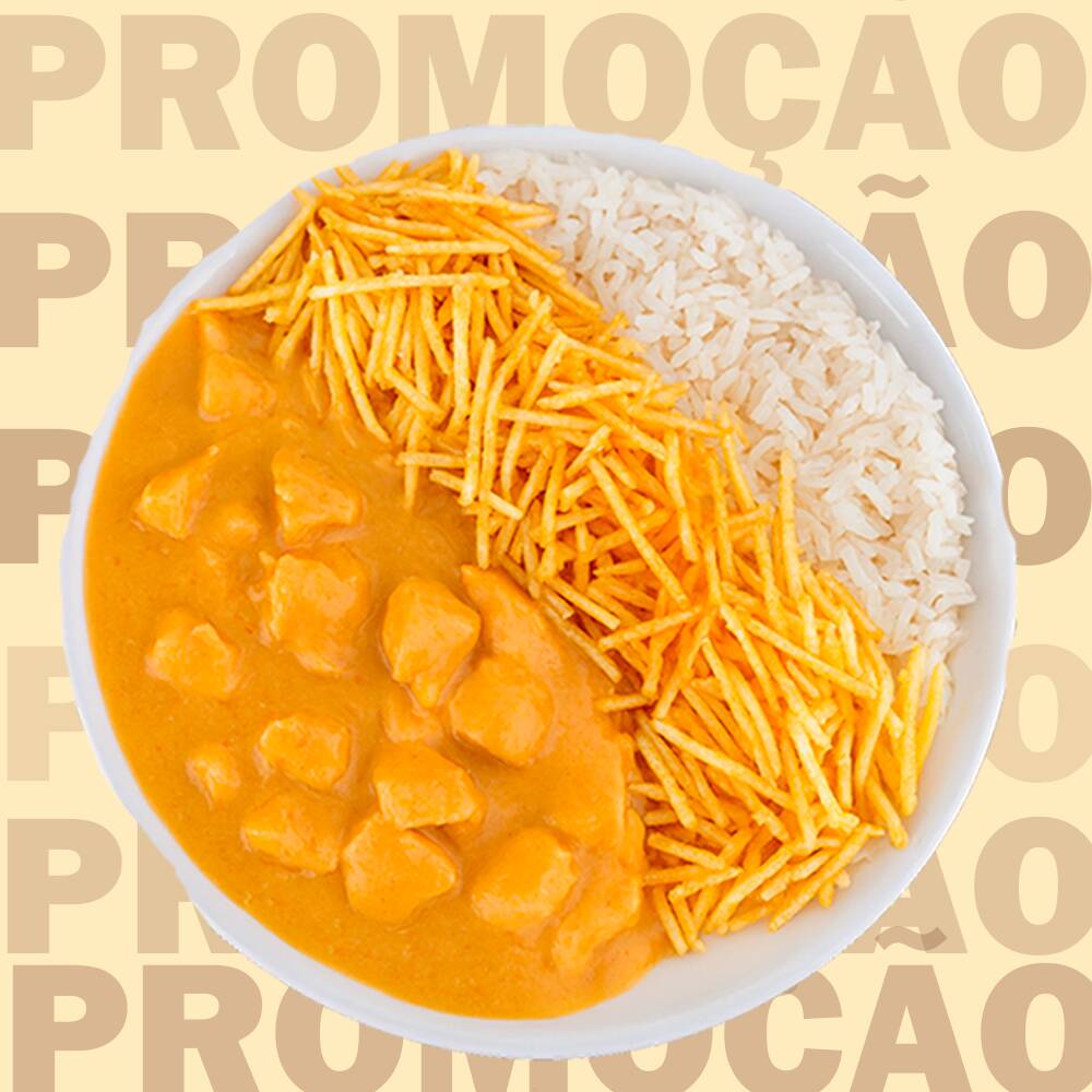 Arroz soltinho no alho, strogonoff de frango cremoso e batata palha separada.