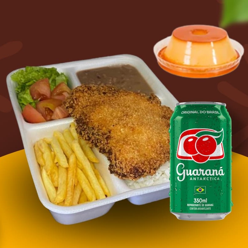 Maravilhoso combo de Arroz branco, feijão de caldo, batata frita, frango à milanesa e salada, + Guaraná Antarctica 350ml + Pudim. Refeição completa para você!