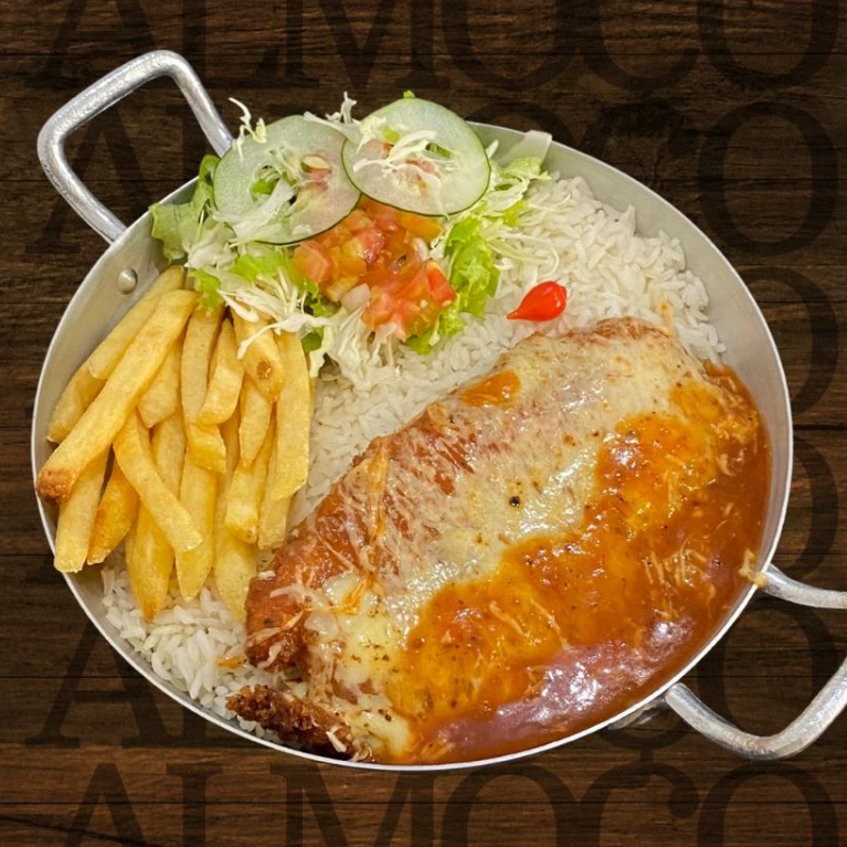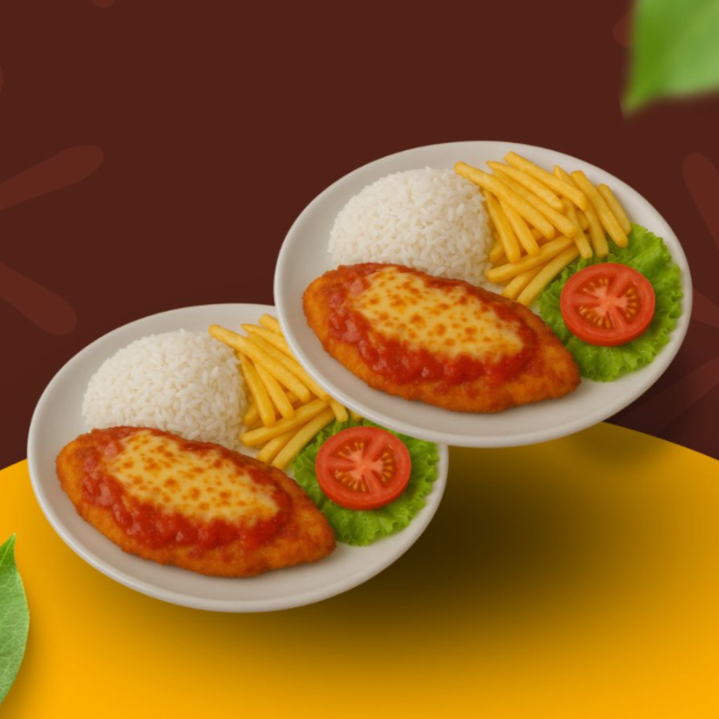 Parmegiana de Frango — Uma combinação irresistível! Filé de frango empanado com crocância perfeita, coberto com molho de tomate artesanal e queijo mussarela gratinado. Acompanha arroz branco soltinho, batata frita crocante e uma salada fresca que completa o sabor com leveza. Um prato clássico, caseiro e cheio de sabor!
