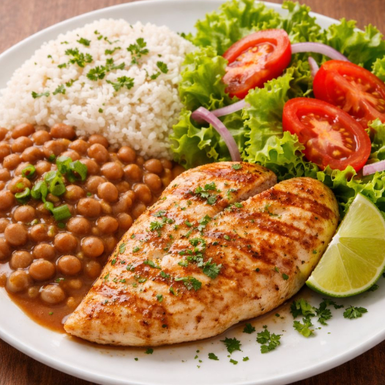 Filé de Frango Grelhado — Leve, saboroso e feito na medida certa! Delicioso filé de frango grelhado, acompanhado de arroz branco soltinho, feijão de caldo bem temperado, batata frita crocante e uma salada fresca que traz equilíbrio e leveza ao prato. Uma refeição simples, nutritiva e cheia de sabor caseiro!