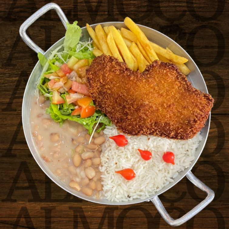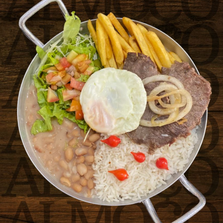 Acompanha: Arroz branco, feijão de caldo, ovo frito, macarrão espaguete, bife acebolado e salada. Uma comida caseira, feita com ingredientes frescos, garantindo um sabor único.