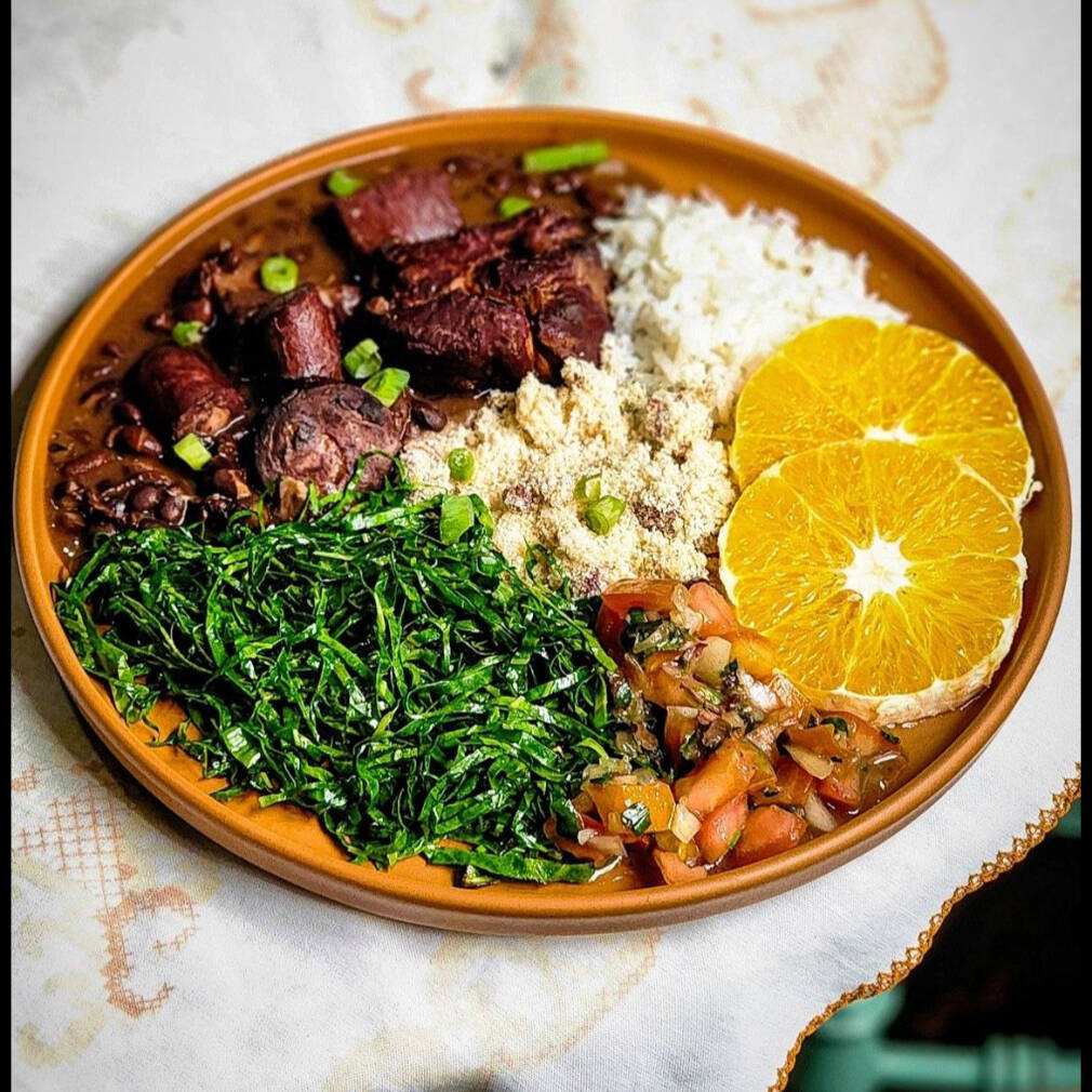 Arroz branco, Feijoada, Farofa, Couve e Laranja
