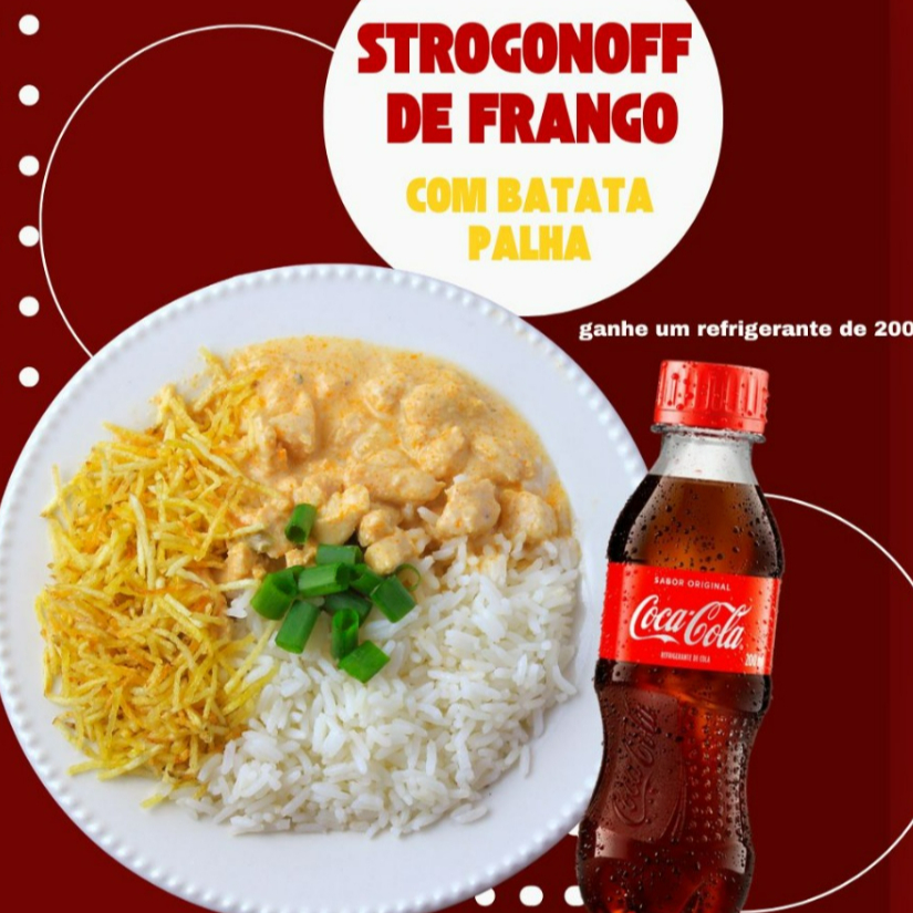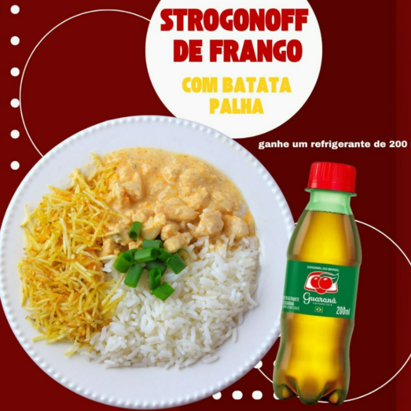 Strogonoff de frango cremoso, com arroz branco, batata palha. + Guaraná Antarctica 200ml.